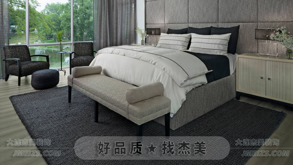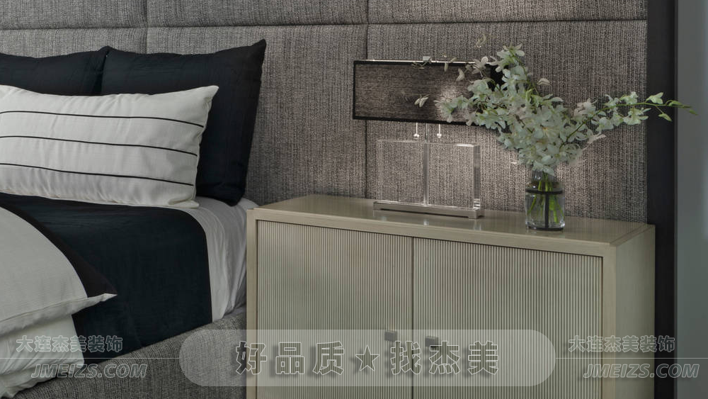 深灰色床體與白色床品色彩對比明顯,柔軟舒適的床上用品確保睡眠質(zhì)量。兩側(cè)床頭柜完整布置,考慮實用性。