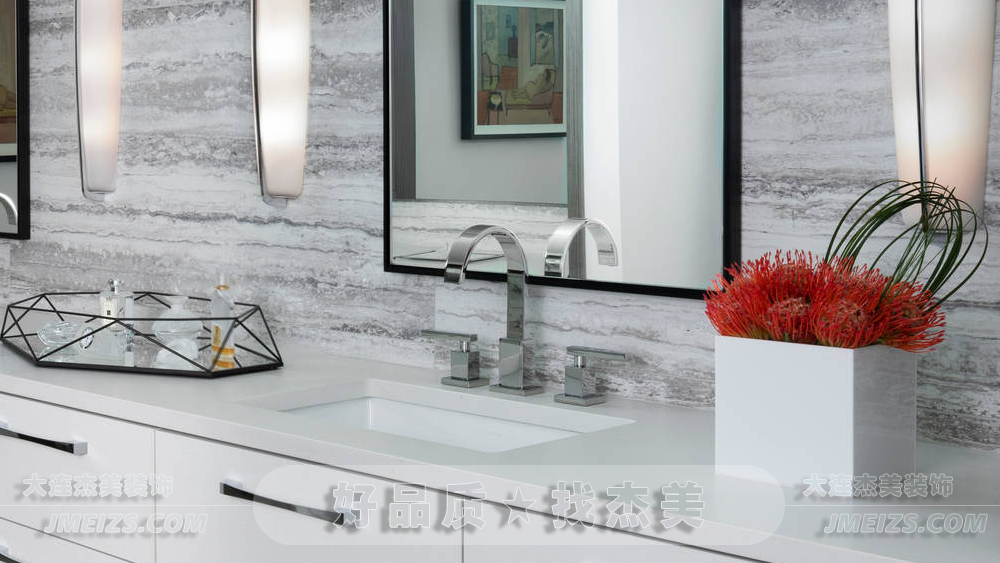 大面鏡擴大空間感,帶來明亮照明效果。金屬質(zhì)感水龍頭與自然紋理灰色石材洗面盆契合簡約風(fēng)格。